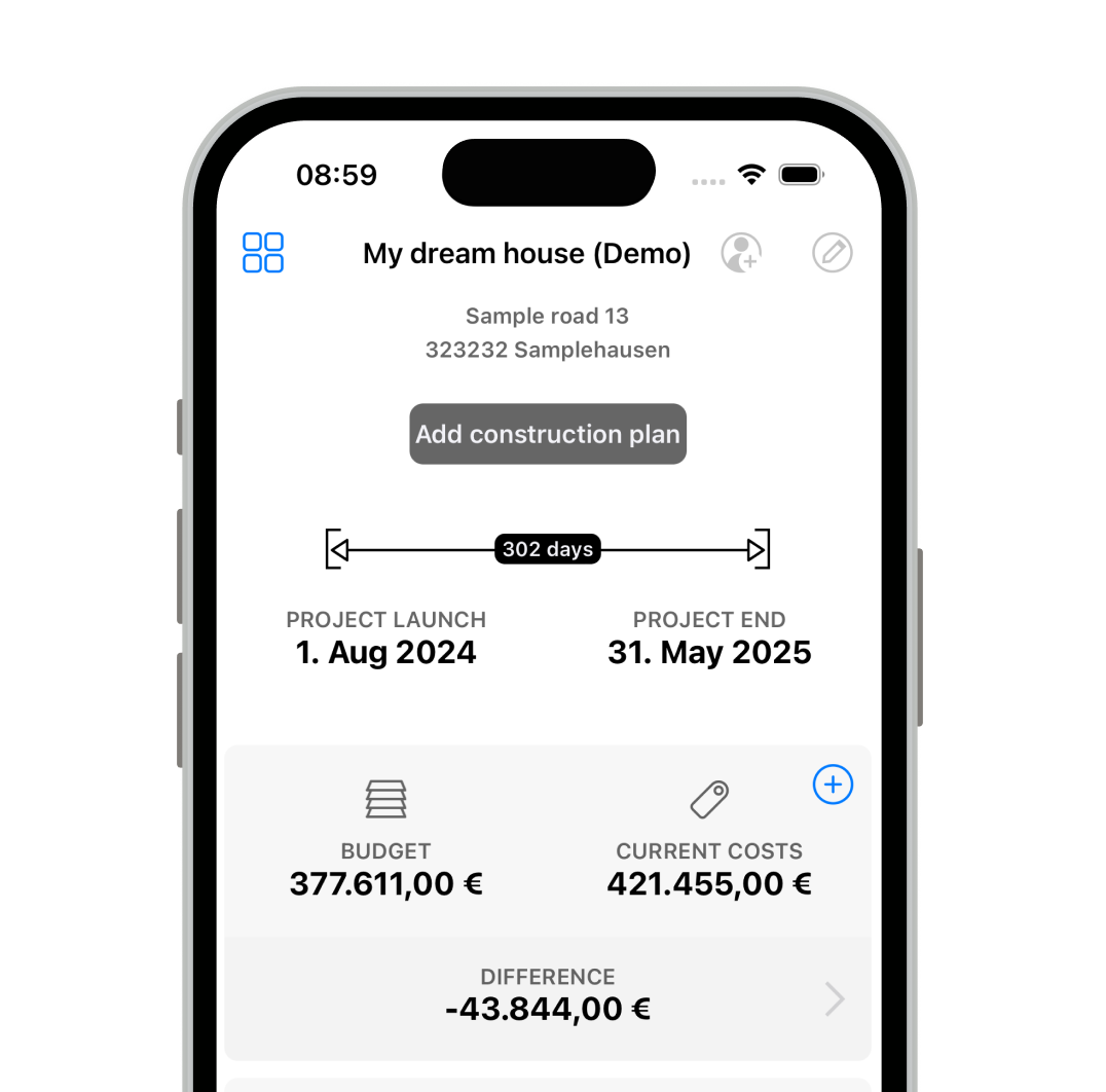 Keeping an eye on all construction costs is important, after all it is your money. PlanBuildPro helps you to record all expenses and deposits. Enter the expenses (planned or already paid) and preferably with an attachment (PDF or JPG of the original invoice or offer). With the „budget-o-meter" you have all the relevant figures at a glance and you can see directly whether you still have financial leeway.